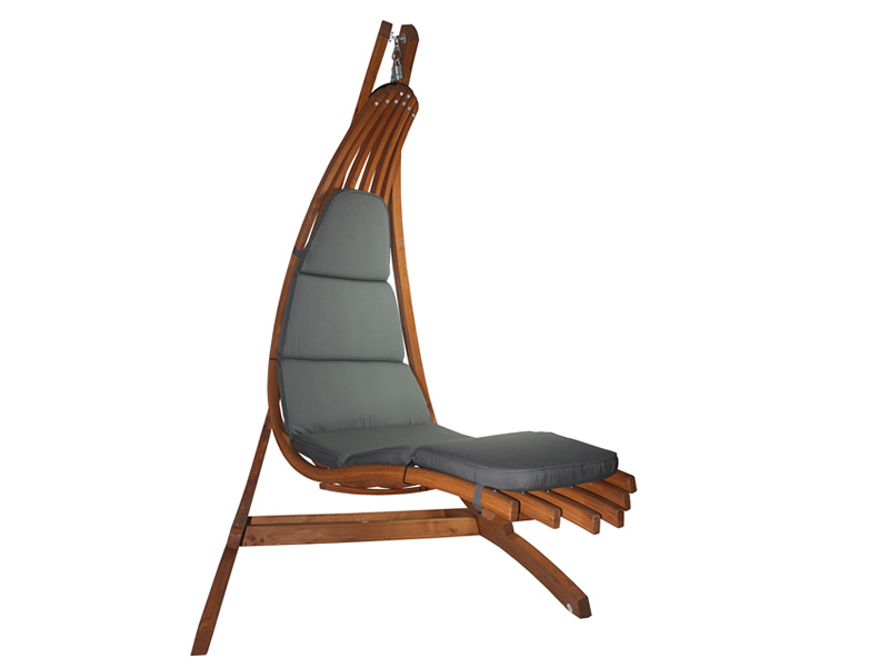 Drewniany leżak wiszący Wave i stojak Optimist wykonane zostały z drewna świerku skandynawskiego techniką gięto-klejoną. Produkt impregnowany zanurzeniowo i barwiony lazurą czyli produktem woskowo-olejowym zabezpieczającym drewno przed wilgocią.
