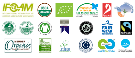 Istnieje kilka różnic w przepisach krajowych, które uwzględniają warunki danych państw. Wszystkie jednak dotyczą międzynarodowych ustaleń. Co więcej wszystkie odnoszą się do Międzynarodowego Ruchu na Rzecz Rozwoju Upraw Ekologicznych (FOAM). Producenci organicznych włókien bawełnianych muszą dostosowywać się nie tylko do wymogów ich państw, ale także muszą spełnić wymagania państw, do których będą wysyłać swoje produkty. Ta cała procedura tylko brzmi groźnie i skomplikowanie. W rzeczywistości jest zupełnie inaczej, między innymi dlatego, że istnieją międzynarodowe standardy, które ułatwiają cała procedurę pozyskania certyfikatu. Gleby uprawne, na których używano środków chemicznych i na których obecnie rolnicy chcą uprawiać bawełnę organiczną, muszą to robić dwa, trzy lata zanim uzyskają certyfikat. W tym czasie uprawiana bawełna określana jest mianem produktu przejściowego. Jest ona sprzedawana za niższą cenę niż bawełna organiczna, ale także nieco wyższą niż zwykła bawełna. Organizacją, która nadaje certyfikaty, ale i pomaga zmienić uprawę z nieorganicznej na organiczną jest: Textile Exchange – dawniej Organic Exchange, a procedurami które na takie działania pozwalają są: OE 100 Standard i OE Blended Standard. Kiedyś powszechne było zjawisko nieujednoliconych wymogów które trzeba było spełnić, aby uzyskać certyfikat, szczególnie jeśli chodziło o odzież. Dzisiaj sprawa ta wygląda zupełnie inaczej, głównie za sprawą organizacji Global Organic Textile Standard (GOTS), która ustala międzynarodowe standardy. Po raz pierwszy zadebiutowała ona na targach BioFach w Norynbergii, w lutym 2008 roku. Do końca roku 2009 istniało już ponad 2800 certyfikatów wydanych przez GOTS. Zostały one nadane producentom z ponad 50 krajów. Certyfikaty GOTS uwzględniają nie tylko bawełnę organiczna, ale także dbają o drobiazgi, takie jak: suwaki, nici, guziki czy barwniki. Organizacje takie jak GOTS, Organic Exchange Standards są prekursorami w nadawaniu certyfikatów i ustalaniu wymogów. Istnieją także komercyjne przedsiębiorstwa i inicjatywy. Ich loga oraz linki do stron znajdują się poniżej:
