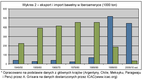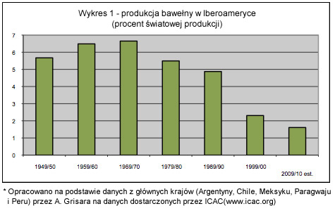 Znaczna część państw Ameryki Łacińskiej była przez dekady dobrze prosperującymi ośrodkami produkującymi bawełnę. Do lat dziewięćdziesiątych XX wieku znaczna część produkowanej w tym rejonie bawełny była eksportowana. W ten sposób napędzała rynek pracy i tym samym poprawiała sytuację ekonomiczną danego kraju. Ilość produkowanej bawełny zaczęła spadać w latach osiemdziesiątych XX wieku i nigdy nie powróciła do stanu sprzed roku 1980. Argentyna, Peru, Paragwaj, Kolumbia i Meksyk produkowały prawie 7% bawełny na świecie. Obecnie wartość ta spadła do zaledwie 2 % (wykres nr 1). Eksport bawełny zaczął ponownie spadać po roku 1990 co spowodowało, że dziś: