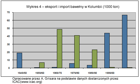 W najgorszej sytuacji zdaje się być Kolumbia. W czasach świetności zapewniała ona 1,1% światowego zapotrzebowania na bawełnę, dziś to zaledwie 0,11% (wykres nr 3). Podczas gdy Kolumbia eksportowała blisko 50.000 ton bawełny rocznie (to więcej niż 10 lat temu), importowała aż 70.000 ton (wykres nr 4), co stanowi 70% zapotrzebowania Kolumbii na nieobrobioną bawełnę. |