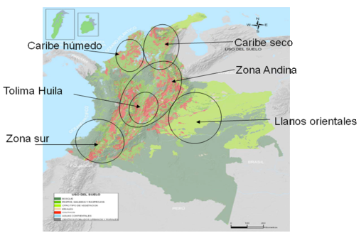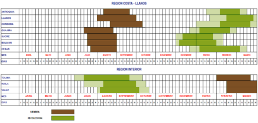 Strefa Caribe húmedo, w szczególności okolice Cereté, odegrały znaczącą rolę w narodowej produkcji bawełny. Istnieją jednak przesłanki wskazujące na szansę polepszenia sytuacji uprawy bawełny w kraju. ![]() Pola uprawne Natagaima, Tolima Większość kolumbijskich upraw bawełny jest ograniczona przez restrykcje wprowadzone przez Rząd dotyczące czasu sadzenia bawełny. Pozwalają one jedynie na jedno sadzenie w ciągu roku, którego czas kontroluje Instituto Colombiano Agropecuario’ – Ministerstwo Rolnictwa. Nadmorskie regiony (Antioquia, Llanos, Córdoba, Guajira, Sucre, Bolívar, Cesar) mogą sadzić bawełnę od lipca do sierpnia, zbierać plony mogą natomiast pomiędzy grudniem a marcem. Miejsca zlokalizowane wewnątrz kraju, takie jak Tolima czy Huila, Valle mogą uprawiać bawełnę od lutego do października. Obecnie w Kolumbii jest około 4200 rolników zajmujących się uprawą bawełny. Większość z nich zorganizowana jest w związki. Farmy tych rolników są bardzo małe. 50% z nich uprawia mniej niż 3 ha ziemi. Zaledwie 3% ma 50 ha ziemi, którą dzierżawią.