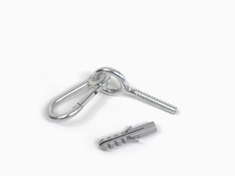W skład zestawu wchodzi: śruba gwintowana, karabińczyk oraz kołek.