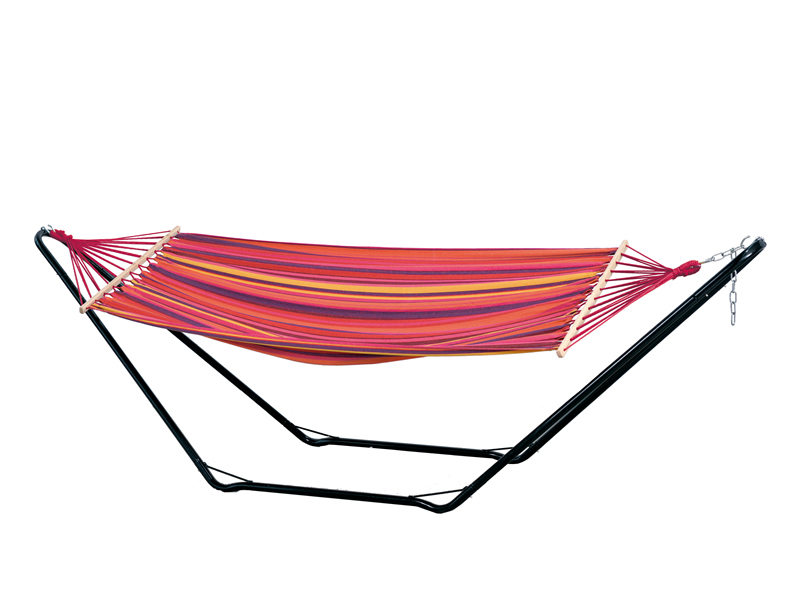 Zestaw jednoosobowy hamak Tonga w kolorze Vulcano i czarny stelaż. Bardzo łatwy w montażu, gdyż montaż nie wymaga narzędzi. W stelażu zamiast śrub zastosowany jest pomysłowy system zatyczek i kołków w specjalny sposób zabezpieczonych przed rozsuwaniem się. Zestaw posiada łańcuchy do powieszenia hamaka. Opakowany w stosunkowo niewielkich rozmiarów pudełko zapewnia zarówno łatwość transportu jak i przechowywania, co pozwala nie tylko na zaoszczędzenie domowej czy ogrodowej przestrzeni, ale również na dalsze wycieczki samochodowe z tym zestawem.